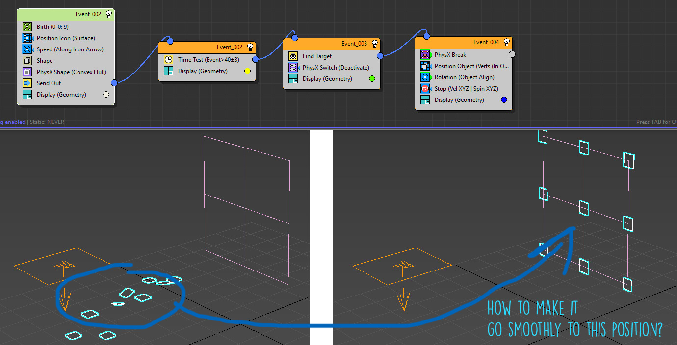 How to "Find Target" go smoothly to the position? - Johncro - 05-29-2019 Hi everybody, I'm only a beginner so... ![]() How can I make particles go smoothly to the "position"? I don't get it. I'm sending my file and the screenshot. Thanks for this great plugin! John RE: How to "Find Target" go smoothly to the position? - d4rk3lf - 05-29-2019 In the find target operation you have "Ease In" parameter, that is there just for that. ![]() RE: How to "Find Target" go smoothly to the position? - Johncro - 05-29-2019 (05-29-2019, 10:06 AM)d4rk3lf Wrote: In the find target operation you have "Ease In" parameter, that is there just for that. I know, but it doesn't go "easy" as it should. Could you please try it? Thanks a lot! ![]() RE: How to "Find Target" go smoothly to the position? - d4rk3lf - 05-29-2019 Is this work for you? 3ds max 2018 ups.. attachment RE: How to "Find Target" go smoothly to the position? - Johncro - 05-29-2019 (05-29-2019, 10:57 AM)d4rk3lf Wrote: Is this work for you? Thanks for the effort! ![]() But, I need it just like in the original scene. First, I need particle "Boxes" to be in "PhysX" mode and then to go smoothly to the plane (perfectly aligned). I need this kind of tyflow structure for some more complicated animation. Thanks again! ![]() RE: How to "Find Target" go smoothly to the position? - d4rk3lf - 05-29-2019 I don't have time to play right now with it. But my first thought's are: If you want perfect alignment, and perfect position, I would make basically 2 particles system, where one is on the final position, and the other is on the starting position. They must be the same number. Then you save position with "custom properties" operator the first particles (final position). And you load that position with same operator (custom properties) for the second particles. They should go to the final position, and you can make them smooth out with "interpolation" parameter inside "custom operator" (the one that is loaded (on second particles). At least in theory ![]() Check out the sample files: In the fracture folder, there is a "face fracture" scene, where it does exactly what I described above (though, they are not moving, just rotating... but it's the same principle...) RE: How to "Find Target" go smoothly to the position? - Johncro - 05-29-2019 (05-29-2019, 11:46 AM)d4rk3lf Wrote: I don't have time to play right now with it. Thanks a lot! Will try it! ![]() ...but if I don't make it, I'll be back hehe ![]() RE: How to "Find Target" go smoothly to the position? - Johncro - 05-29-2019 I'm back ![]() Noup... it's not working for me. I don't know if this is possible or not. Please see the attachments. I tried with custom properties but it's not working. Is this a BUG or I don't know how to use it, but it should be a very simple task: 1. boxes are in perfect alignment (3x3) 2. boxes falls down (PhysX) 3. boxes are back in perfect alignment (start position) Please anyone, if you know how can this be done, please help me... Thank you ![]() RE: How to "Find Target" go smoothly to the position? - lmw17009 - 06-01-2019 particle born use property set the tm data, then you can use property load data,the tyflow sence simple file have this,the same to your sence RE: How to "Find Target" go smoothly to the position? - Johncro - 06-01-2019 (06-01-2019, 02:58 PM)lmw17009 Wrote: particle born use property set the tm data, Thanks! I know about TM data and how it works, but the thing is that if I add PhysX it doesn't work as it should, and even if I switch it off (PhysX), it still doesn't work. It works only without the PhysX. I have reported it as a bug and tyFlow said it might be a bug. Could you please let me know where is that "tyflow sence simple file"? What is the name of the file? Thanks a lot! ![]() RE: How to "Find Target" go smoothly to the position? - d4rk3lf - 06-02-2019 I just did it. Here's the video: https://youtu.be/QoZMt5Ei0Pc In the attachment are files for max 2017 and 2018. Notice the changes I made in the "custom properties" (the last one, in the last event), and I changed timing to "continuous", and interpolation to 0,1 (so it's smooth). Maybe that was "bugging" you. RE: How to "Find Target" go smoothly to the position? - Johncro - 06-02-2019 (06-02-2019, 11:25 AM)d4rk3lf Wrote: I just did it. I love you brother, you've even upload it on youtube ![]() But... I have to be honest with you. As I said, I need this for much complex scene. This boxes are going to be 100s small screens that are going to create a grid of display, so it just has to be perfectly aligned. You can see that your boxes are pretty close but it's not perfectly. I already reported this as a bug and tyFlow assumes that it could be a bug. It's probably the PhysX. So, I just continued working without PhysX, and it works perfectly. Thank you so much for helping me! ![]() RE: How to "Find Target" go smoothly to the position? - d4rk3lf - 06-02-2019 Oh... I see... If you turn off "spin random" operator in my scene, they should be back in perfect position (I just tested it). I gave it spin random, only so I make it visually more interesting. If you want spin to be there, then you can try saving the rotation parameter in custom properties, and load them back. As for the Physx... maybe it's bug... bot notice this. Physics by default have gravity that constantly pulls particle down, and you can't expect to work perfectly, because you need to add a force that will fight will gravity all the time. I just animated gravity in Physics (select tyflow icon, and go to modify panel to find it) so it's zero after the boxes fall down - and it's working ![]() RE: How to "Find Target" go smoothly to the position? - Johncro - 06-03-2019 (06-02-2019, 01:05 PM)d4rk3lf Wrote: Oh... I see... Thank you very much!!! ![]() RE: How to "Find Target" go smoothly to the position? - lmw17009 - 06-03-2019 I was stuck in property before, just change the parameter to continue. I think you've done it, haha. RE: How to "Find Target" go smo