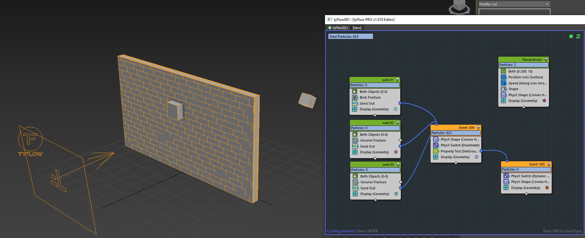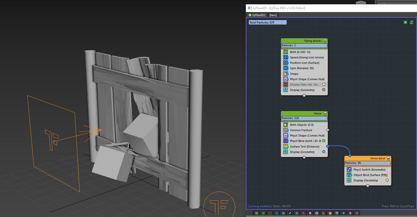 In the image “fence-tyflow” this works perfectly how I would like, there are 2 physX sims, 1 for the fence and 1 for the collision cubes hitting it. This works great.
