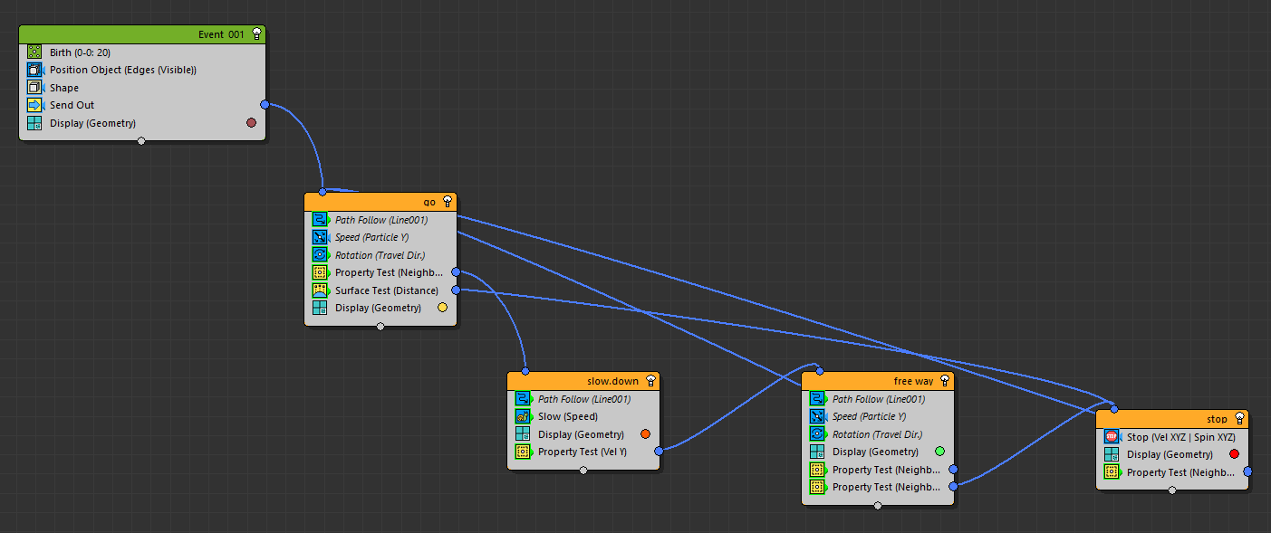 - cars should not rear-end each other -> I've tried to solve it with Bindings and Particle Physics but I feel like I can't figure out how to set it up properly. My idea is that Particle Physics collision should only act as a trigger that sends car/particle to another event that deaccelerates it with Slow operator for example.
