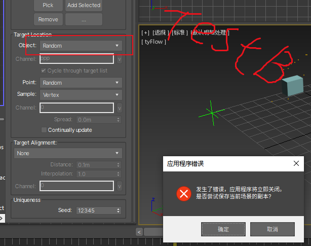 The Find Target operator has a high probability of error. I saved the scene before the two errors. The testA scene picks up Point001 and an error occurs; the testB scene selects Random. The specific reason is unknown. I took a screenshot and uploaded the max file.