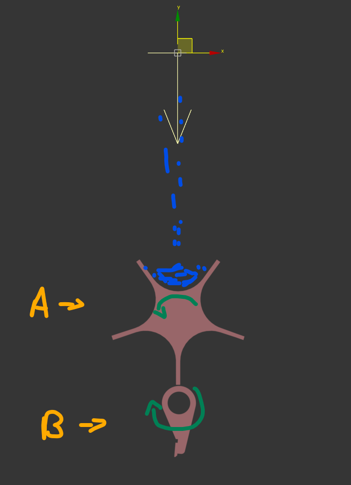 The main issue I'm facing is making the particles stick to the face of the rotating A mesh, when the cup holding the particles ends up on the bottom side.